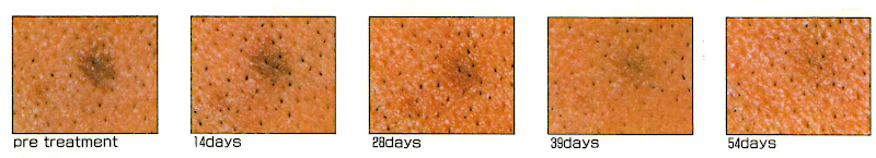 クレンジング、洗顔ソープ、洗顔フォームで汚れを落とします。暖かいタオルをシミ部分中心にあてて覆います。2.3分して・・・・シミ専用乳液を3、4滴手のひらにとり、気になるシミの部分に軽く刷り込むようにマッサージして導入を促してください。