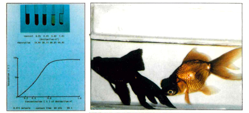 右の写真はメラニン色素吸着 粒子 (MK粒子) 桑白皮エキス、ヒノキチオールなど配合のローションを水道水にとかし、黒色の出目金魚を2ヵ月間飼育すると黒色が消失して金魚本来の薄い黄金魚になることを示す実験成績です。もとの水道水にもどして飼育すると元の黒色にもどります。 (写真提供: 薬理学中央研究所)