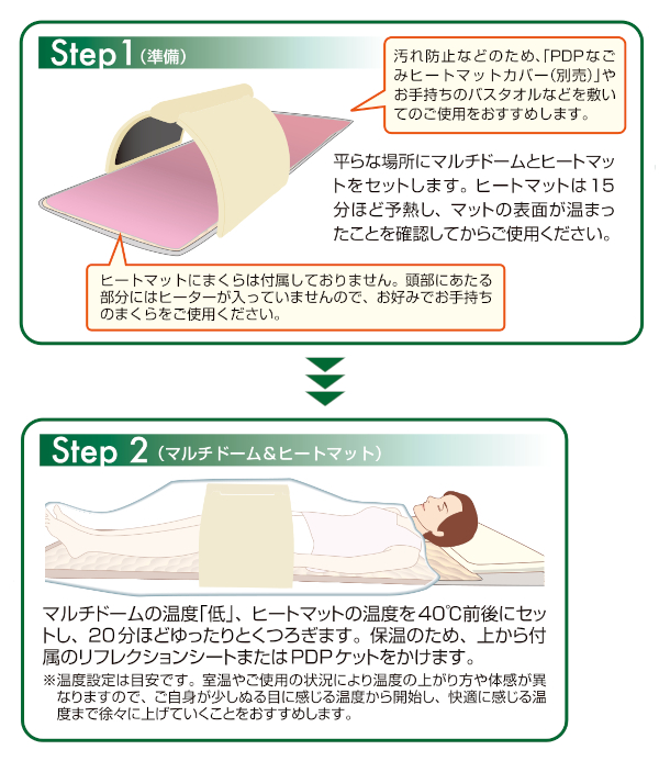 ※初めてご使用になる際の参考例を掲載しています。使い慣れるにしたがい、体調・体質などに合わせた時間や温度をお好みで設定してください。