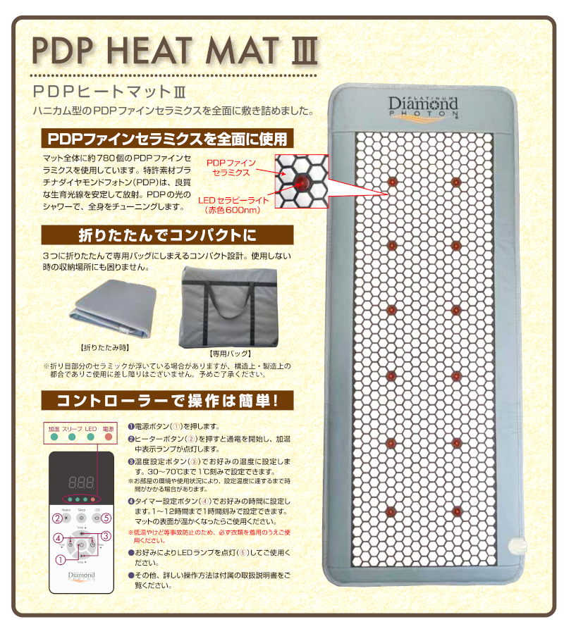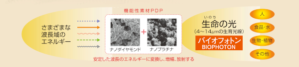 プラチナダイヤモンドフォトンは、 ナノプラチナとナノダイヤモンド、それぞれの優れた機能を合わせ持ち、これまでにない高エネルギーを効率よく安定 して放射する機能性素材です。静電気などの摩擦エネルギーや、人体から出る赤外線、その他あらゆる波長域のエネルギーを吸収し、安定した波長域のエネルギー変換 増幅して放出します。この増幅された光を"バイオフォトン”と名付けています。